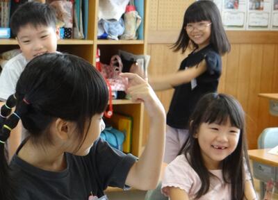 お誕生日集会のゲームを考えながらわくわくの1年生