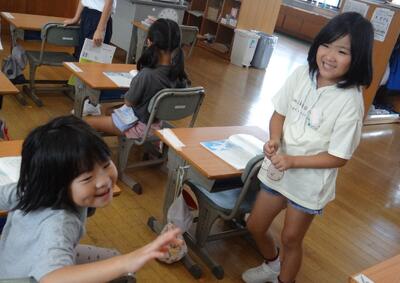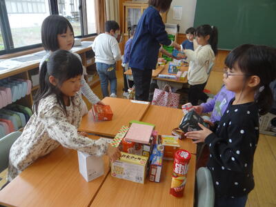 1年生はおかしの箱を「なかまわけ」