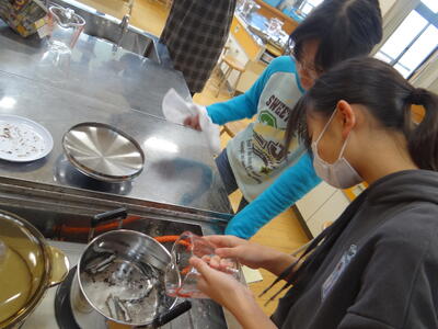 家庭科の実習の前に朝からお鍋に煮干しを