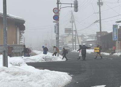 雪道登校に引率してくださる役場の職員さんや地域の皆様