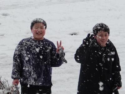 休み時間は大粒の雪に戯れ