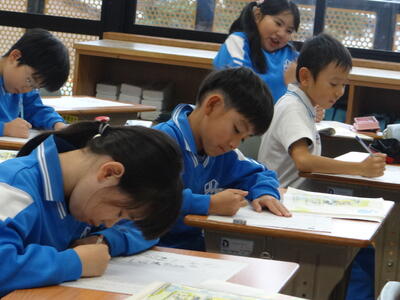 教え合い、自分たちで〇付けして進める1年生