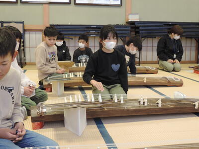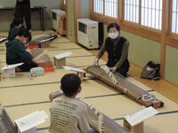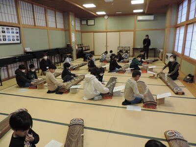 師範の田宮さんと谷地八幡宮舞楽の林さんのご指導の下
